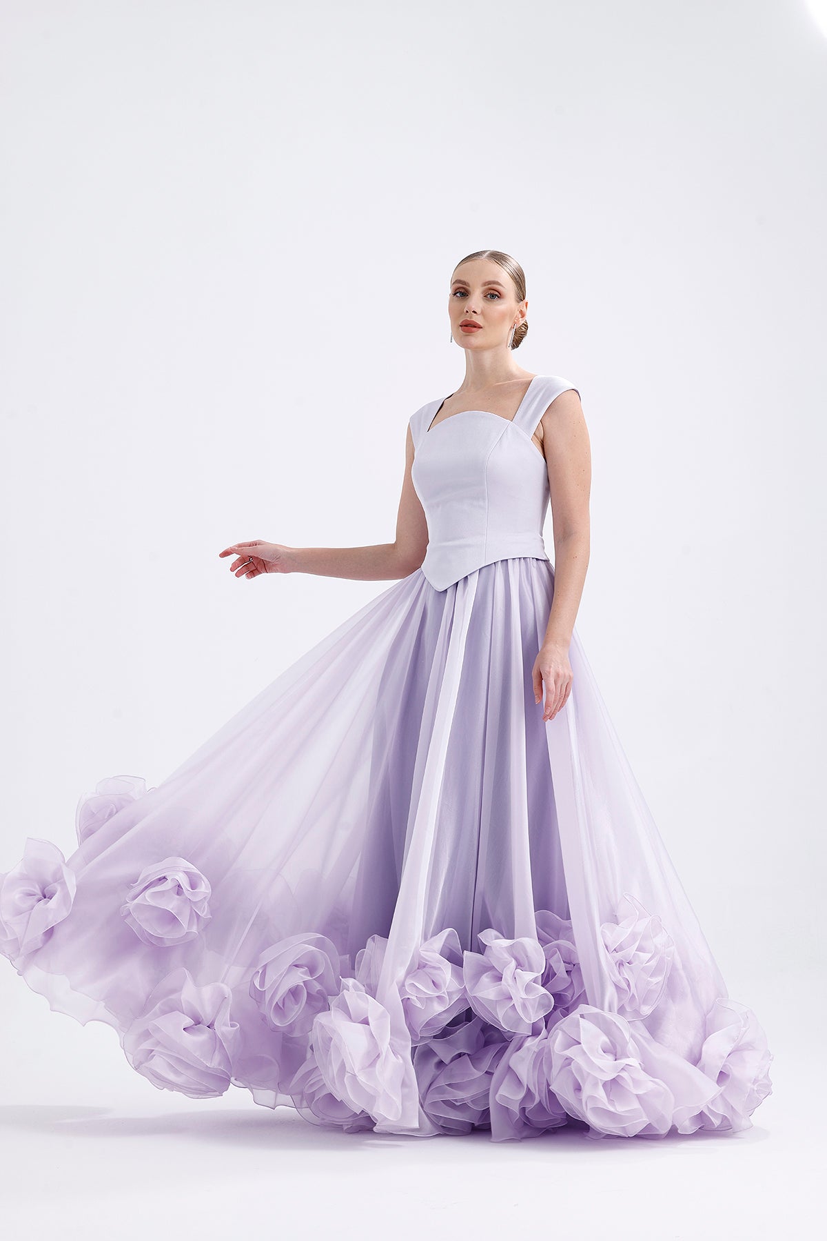𝐒𝐇𝐄𝐋𝐁𝐘 Düşük Omuzlu Organze İşlemeli Uzun Abiye Elbise