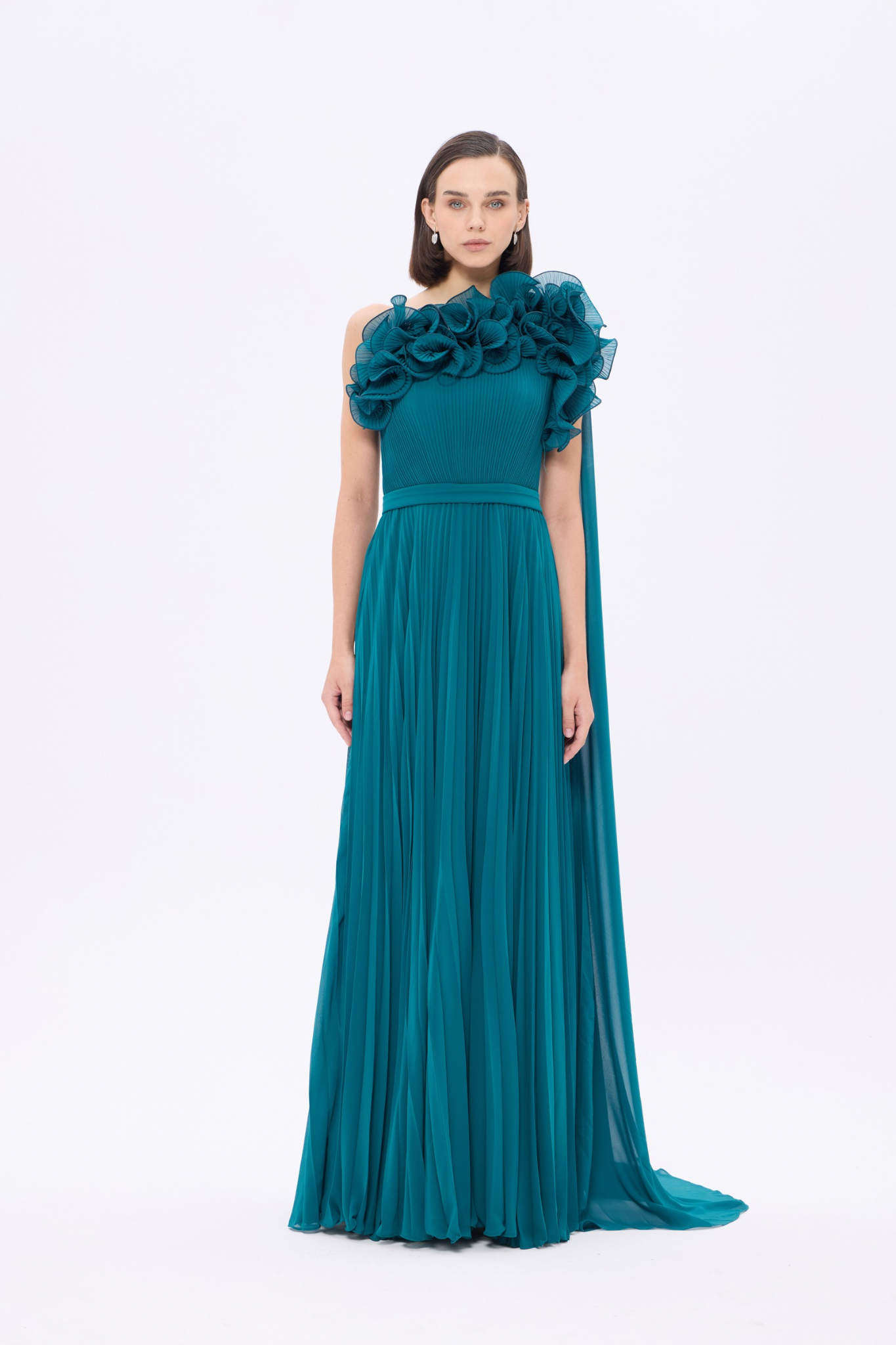 𝐄𝐋𝐈𝐒𝐀 Fırfır Yakalı İnce Pliseli Şifon Uzun Abiye